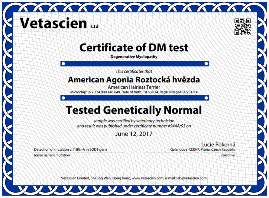 Elinka (American Agonia) dnes obdržela výsledek testů DM - s výsledkem "Normall" - bez mutace!!!